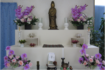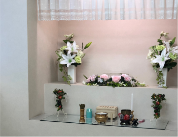 慈悲深い観音像が安置された祭壇の両側に個室の納骨堂を完備しております。棚の中にはご遺骨と共にお写真やお花、大好きだったおやつなどをお供えいただけます。2017年に新館となるANNEX館も完成し、より多くのご家族をお預かりできるようになりました。